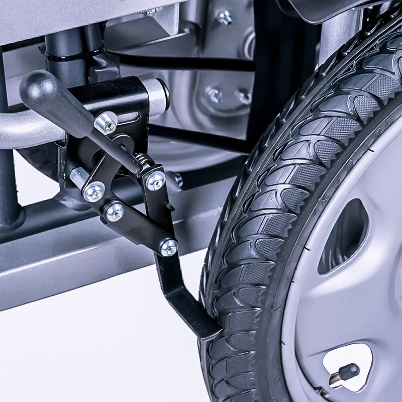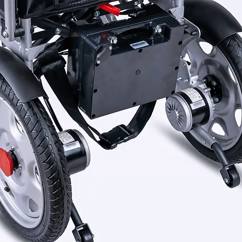 دستههای پشتی این ویلچر برای سهولت در حمل و نقل در خودرو، قابل شکستن هستند و به راحتی میتوانند فضای کمتری را اشغال کنند. همچنین، در قسمت پشت این ویلچر برقی، چرخ های ضد واژگونی نصب شده است تا در صورت وقوع حادثه، از واژگونی ویلچر جلوگیری شود. چرخ های عقب این ویلچر تنفسی و چرخ های جلو توپر هستند و دارای کیفیت بسیار بالایی میباشند. نوع جوی استیک آن، کنترلر pg است و پس از هر بار شارژ، مسافت ۲۰ کیلومتر را طی میکند.